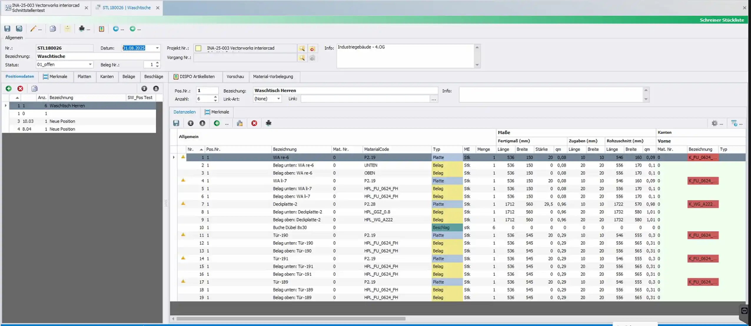 Alle Bauteile eines Möbels – vom Korpus über Beschläge bis hin zu Plattenformaten – lassen sich sauber strukturiert abbilden und jederzeit erweitern oder anpassen.